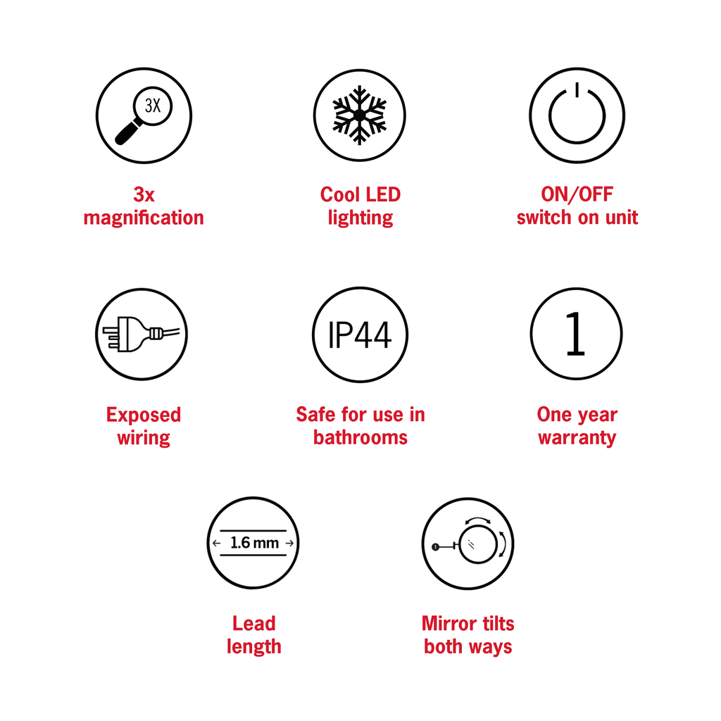 The cool, white LED light is thrown directly onto your face and this coupled with the 3x magnification makes it a perfect option for shaving and make-up applications. The unit features a simple on/off switch on the base of the unit making it simple and easy to control.