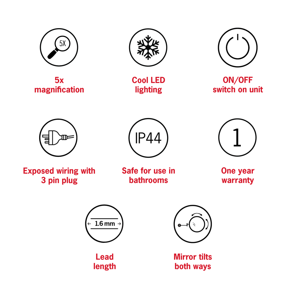 The cool, white LED light is thrown directly onto your face and this coupled with the 5x magnification makes it a perfect option for shaving and make-up applications. The unit features a simple on/off switch on the base of the unit making it simple and easy to control.