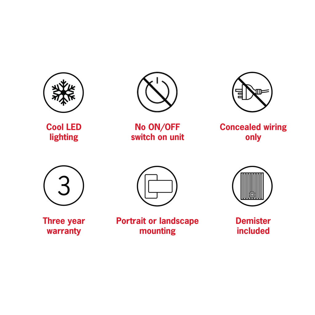 The Ablaze Backlit range mirrors are made to fit your design and space. All of our Ablaze Backlit range mirrors are backed with a 3-year warranty. The features a 5mm silver mirror with a polished edge border. The lighting is featured at the back of the mirror and shines from behind. The cool lighting casts a bright, white light into your room to create gentle ambient lighting This mirror is designed to be hardwired up to a separate switch. This mirror is screwed to the wall and is designed so it can be mounted both portrait and landscape to help you achieve your design. The includes a mirror demister which is a thin heating pad that is installed behind the mirror to prevent the mirror from fogging up. For more details on mirror demisters click here. Please note the mirror demister is attached to the mirror and controlled simultaneously with the lights via an external switch.
