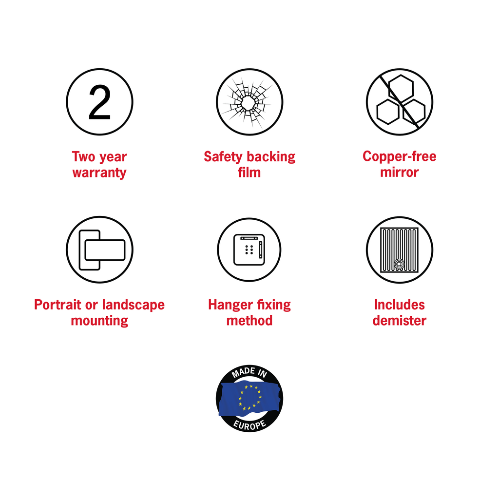 The mirror features a safety backing film and is copper-free. The mirror mounts to the wall with two brackets, with the frame sitting neatly against the wall surface. These mirrors are made in Europe and are backed by a 2year warranty.