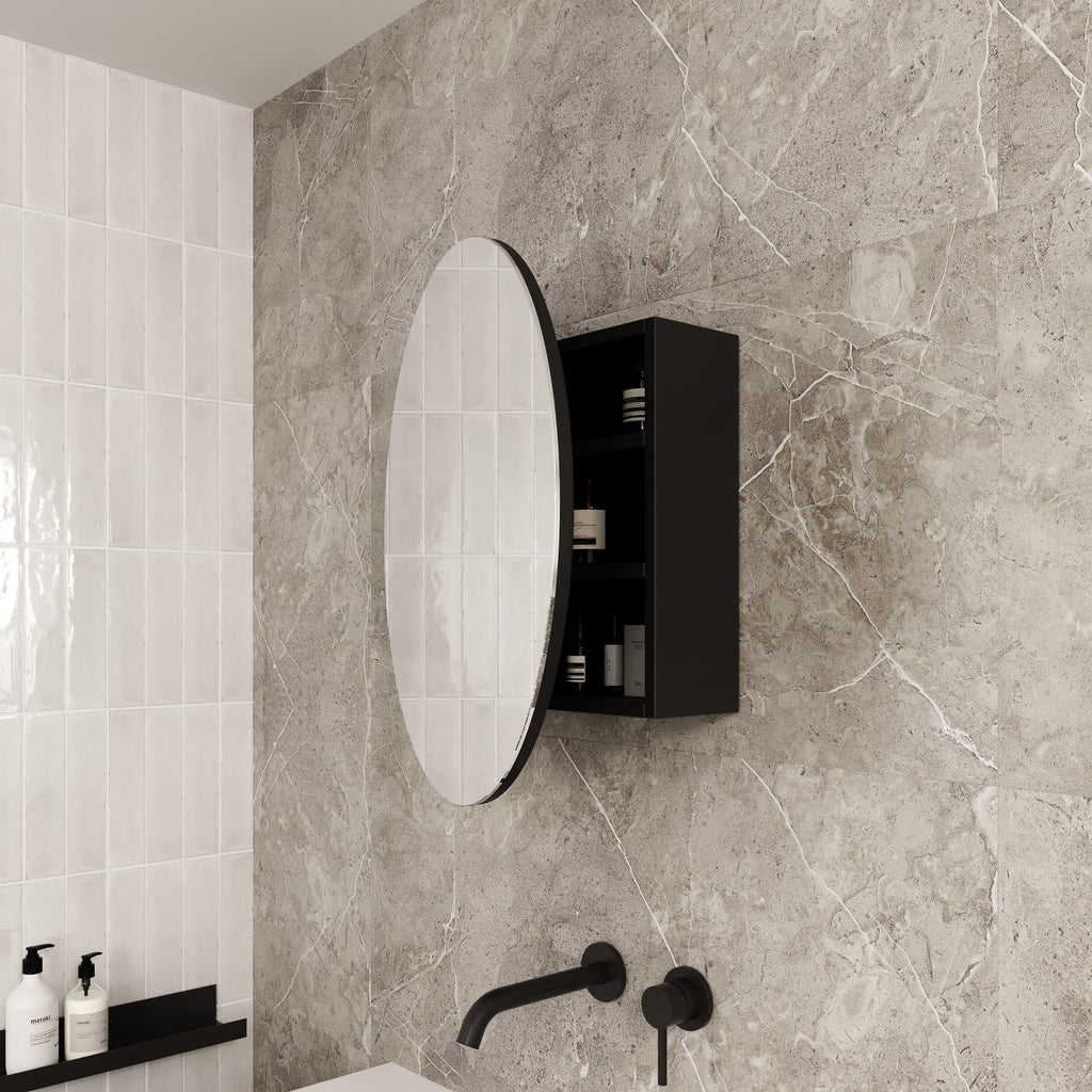 The Round Chelsea Mirror Cabinet offers a great way to add storage to your bathroom. The mirror cabinet features a 600mm round with a 400x400mm cabinet. The CR6060B is made from MDF with a flat black painted finish for a smooth, quality appearance.