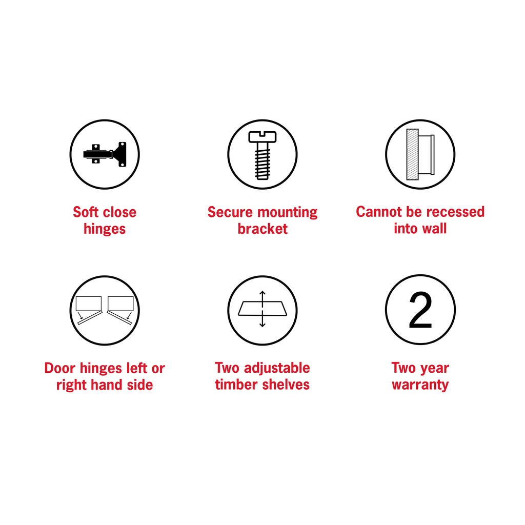 The cabinet features soft close hinges, secure mounting brackets, a solid back and two adjustable timber shelves. The cabinet can be installed to allow for either right or left-hand opening. The mirror cabinet is covered by a two-year warranty.
