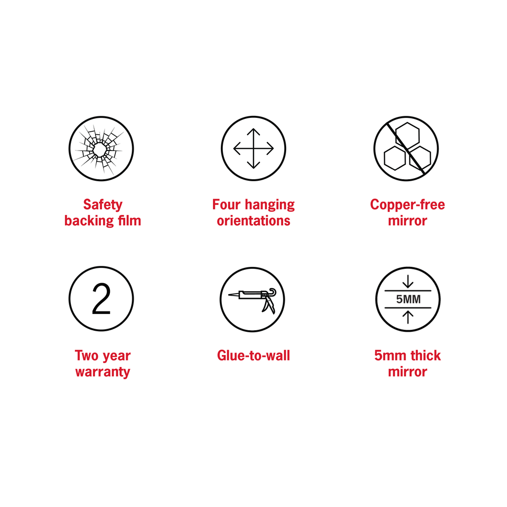 The 5mm silver mirror features a polished edge and is backed by our 2-year warranty. The mirrors feature a commercial-strength vinyl backing, are copper-free, and are edged-sealed to ensure the mirrors do not develop foil creep on the edge.