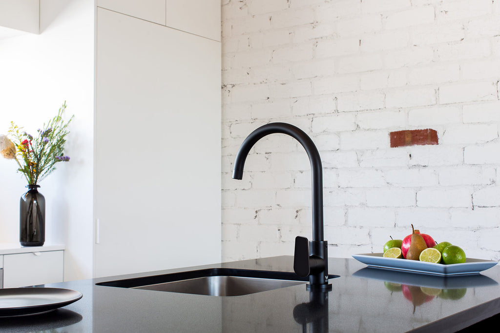 The Matte Black Kitchen Mixer with a paddle handle perfectly blends style and practicality, boasting a solid brass construction and convenient single-handle mixer.