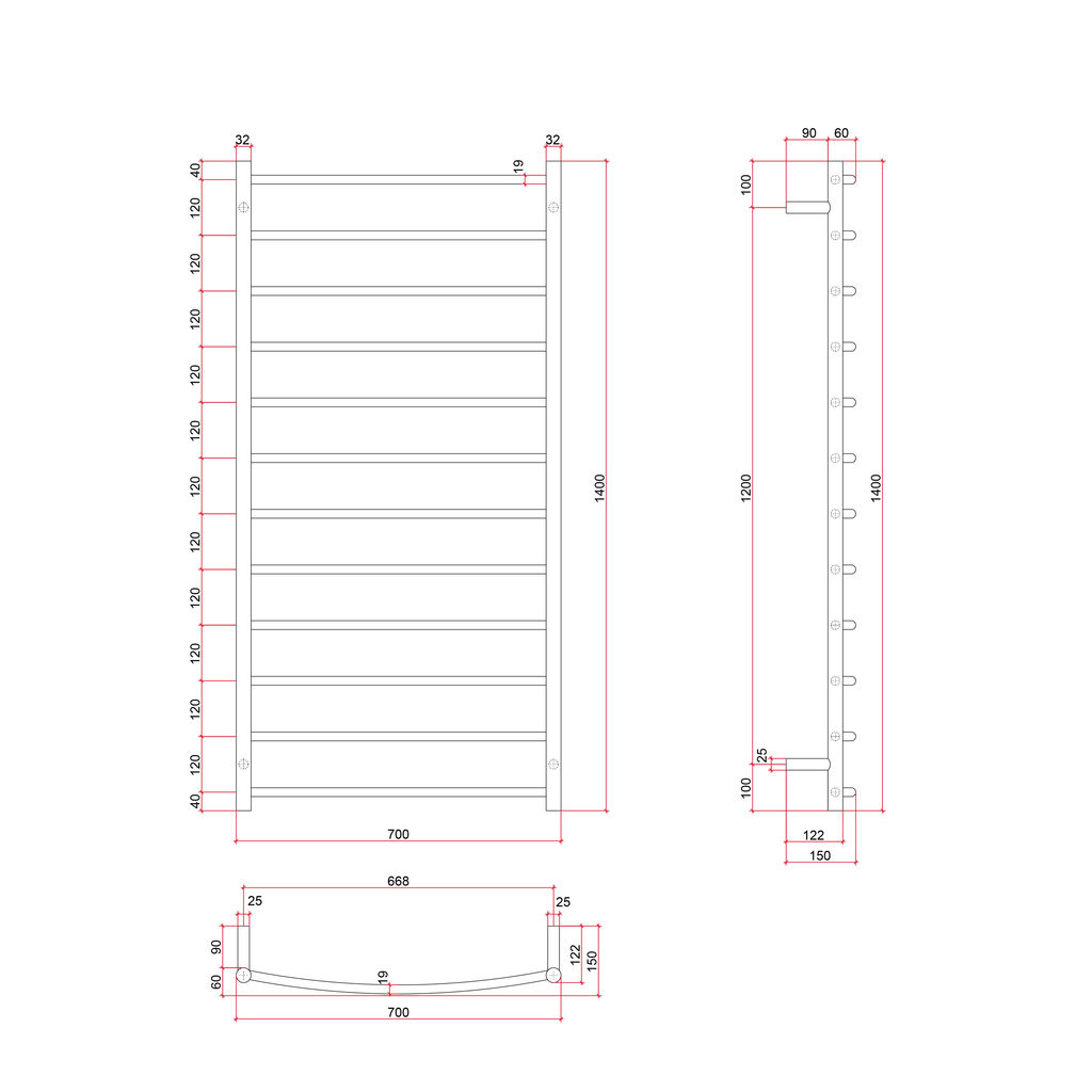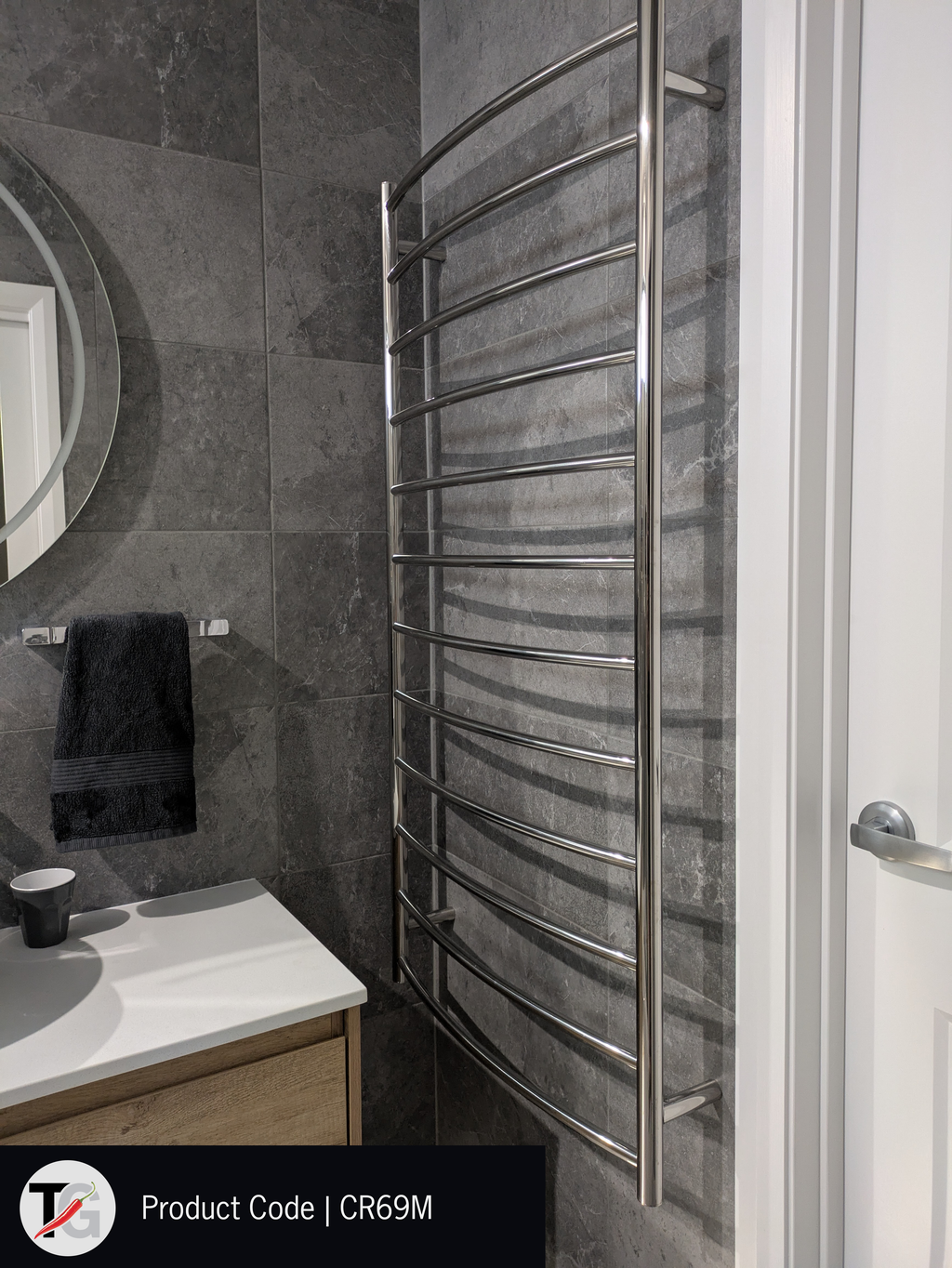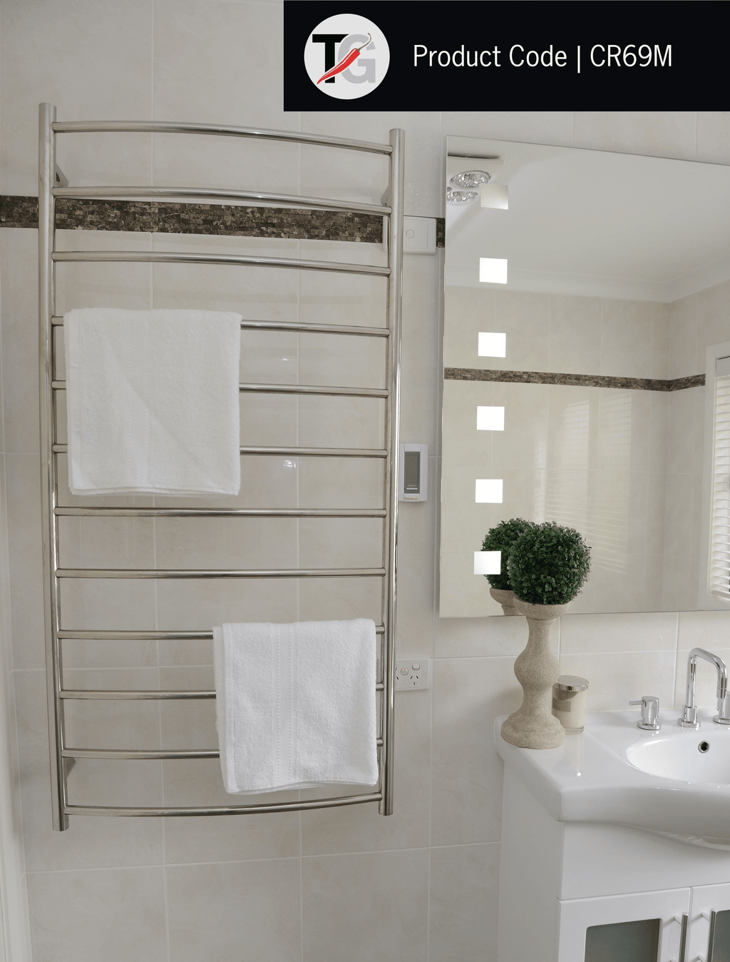 Heated Towel Rails are an affordable luxury for every bathroom for warming and drying your towels. The CR69M Heated Towel Rail is a 700x1400 12 bar polished stainless steel ladder rail which features multiflex wiring. The curved rail design provides additional hanging space for the towels between the rail and the wall.
