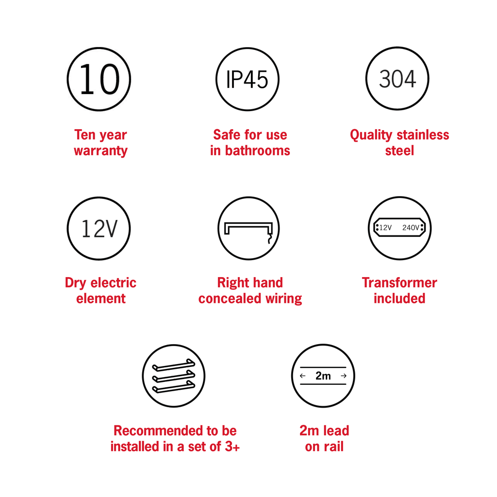 The Thermorail single bar heated towel rails are all 12 volt which means they are safe to be installed anywhere in the bathroom, even close to water. The single rails are designed to be installed in a series of rails limited only by your imagination. We do however recommend a minimum of 3 single rails are used in a set to provide enough heated surface area in contact with your towels to help them to dry.