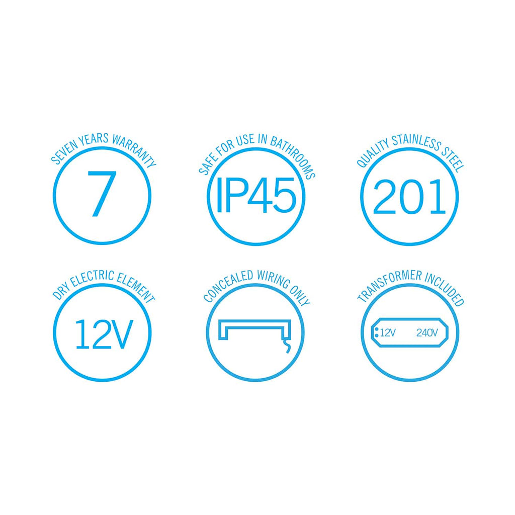 The Thermorail single bar heated towel rails are all 12 volt which means they are safe to be installed anywhere in the bathroom, even close to water. The single rails are designed to be installed in a series of rails limited only by your imagination. We do however recommend a minimum of 3 single rails are used in a set to provide enough heated surface area in contact with your towels to help them to dry.