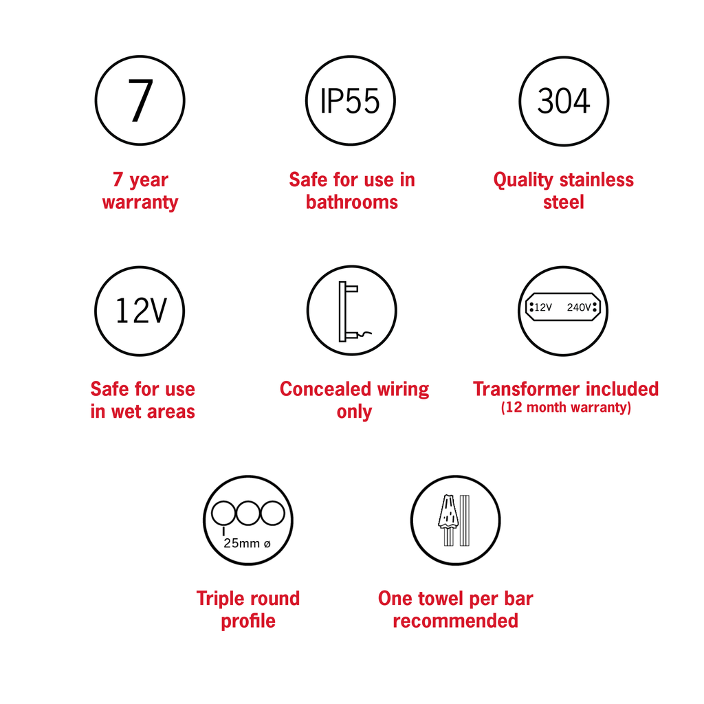 The Thermorail single bar heated towel rails are all 12 volt which means they are safe to be installed anywhere in the bathroom, even close to water. All the 12-volt single bar rails are provided with a transformer in the box. We also recommend the useâ¯of aâ¯timerâ¯to control the rails and save on running costs.