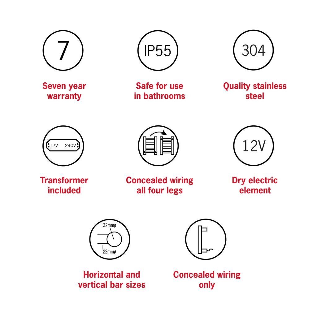 The SRB2512 electric towel dryer is a 12v unit, this means that it can be installed close to a wet area in the bathroom. The rail comes supplied with a transformer which reduces the incoming voltage from 240v to 12v. The rail will still operate at the same temperature and use the same amount of electricity as an equivalent 240v rail as the wattage is the same, however, the rail is operating at a lower voltage.