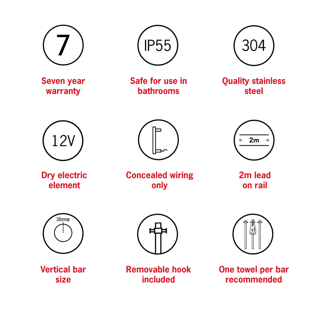 All Thermorail vertical heated towel rails include an optional towel hook which can be fitted on the rail at the time of install. This hook allows for the towel to be more easily hung over the vertical rail. Whilst the vertical rail will assist in drying your towel, it does have less surface contact then a ladder rail and therefore will be less effective in drying and warming your towel than a ladder.