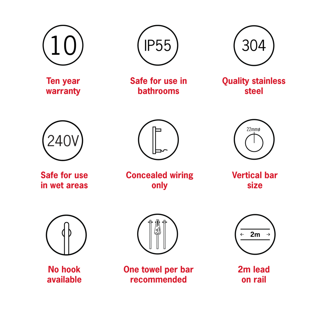 A Heated Towel Rail is an affordable luxury for every bathroom. The Thermorail VT Vertical Heated Towel Rails offer a stunning design feature for the bathroom, featuring a slimline design with a stylish mount. Along with the stylish design, the rails are designed to help dry your towel and create a design statement in your bathroom, particularly with limited wall space. The polished stainless finish of the VTH900 matches perfectly in with your chrome tapware.