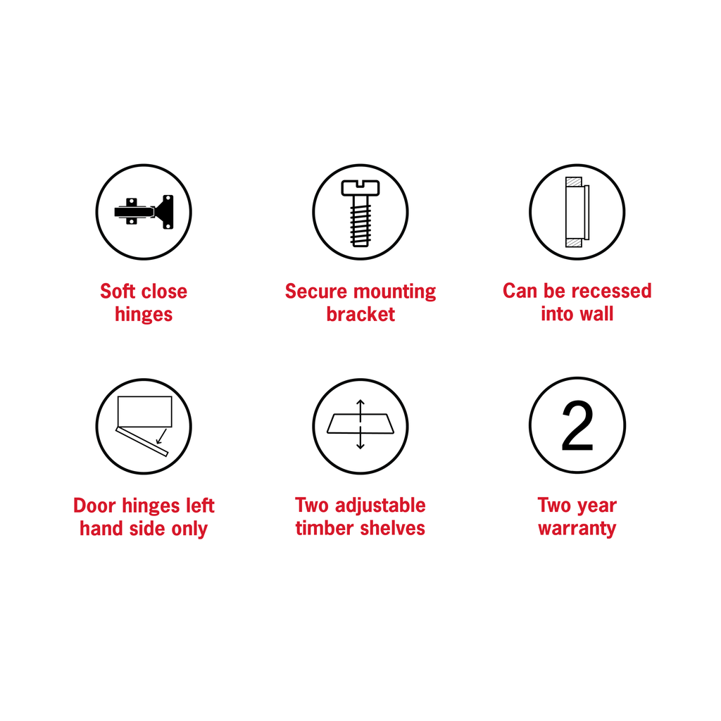 The cabinet features soft close hinges, secure mounting brackets, a solid back and two adjustable timber shelves. The cabinet is hinged on the left-hand side allowing for only right-hand side opening. The mirror cabinet is covered by a two-year warranty.