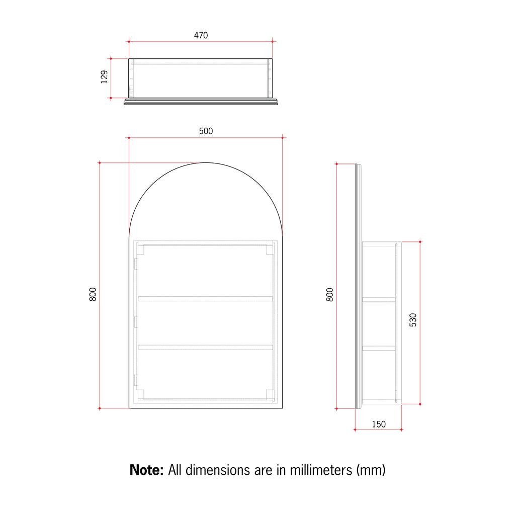The cabinet itself is 129mm deep (109mm internal depth), plus the door thickness of 21mm which gives it an overall thickness of 150mm. The Vienna arch shaped mirror cabinet is able to be recessed (to a depth of 110mm) into the wall cavity to minimise its appearance in the room or can be mounted to the wall surface.